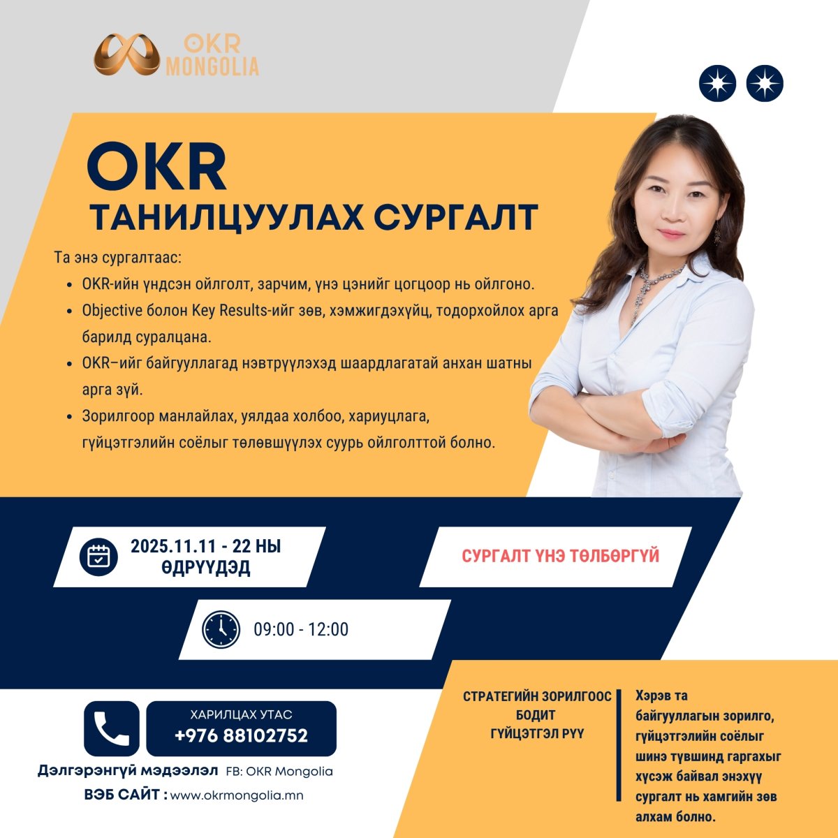 Зорилгоо зөв тавьж, Үр дүнгээ хэмжигдэхүйц болго!Орчин үеийн удирдлагын хамгийн үр дүнтэй системийн нэг болох OKR (Objectives & Key Results)-ийг богино хугацаанд, ойлгомжтой хэлбэрээр суралцах боломж таньд байна.