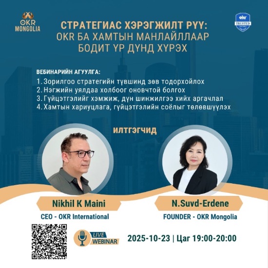 OKR БА ХАМТЫН МАНЛАЙЛЛААР БОДИТ ҮР ДҮНД ХҮРЭХ. Вебинар амжилттай болж өнгөрлөө оролцсон бүх хүмүүст баярлалаа